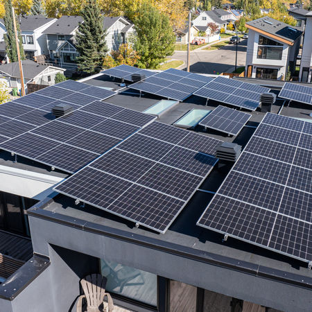 This residential solar PV installation represents a sophisticated approach to residential energy independence through distributed rooftop solar deployment. The precise panel alignment, proper spacing, and integrated roof design hints at a certain quality to the installation, while optimal panel placement captures maximum sunlight throughout the day. The system showcases an extensive array of modern bifacial solar panels on the duplex’s flat roof, meticulously arranged around any roof obstructions, as well as a secondary array on the garage roof, demonstrating a commitment to maximizing the available solar potential. Maintaining aesthetic integration with the home's modern architecture, this system generates substantial daily energy, significantly reducing reliance on grid electricity and providing long-term energy cost savings for both households.