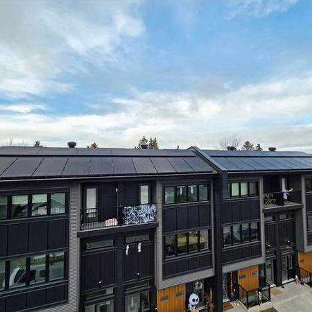 Modern residential architecture meets renewable energy infrastructure in this eight-unit building. The contemporary multi-story dwelling features a sleek black and white exterior with expansive glazed windows that flood the interiors with natural light, but the building's most distinctive feature is its comprehensive solar panel installation. All-black PV arrays cover multiple rooflines in an elegant configuration that maximizes sun exposure throughout the day. The panels are professionally integrated into the roof structure, indicating a deliberate energy-efficient design strategy rather than an afterthought retrofit.